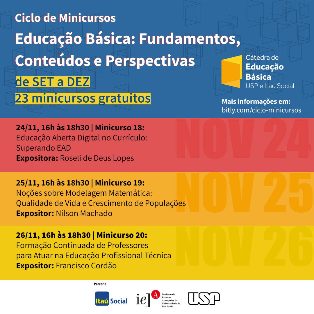 Nos outros dias da semana, serão abordados conceitos de modelagem matemática, como qualidade de vida e crescimento de populações, e também o cenário da formação continuada de professores no Brasil. Para mais informações, acesse bitly.com/minicursos-semana7