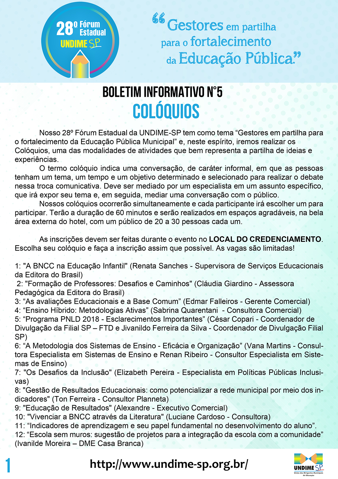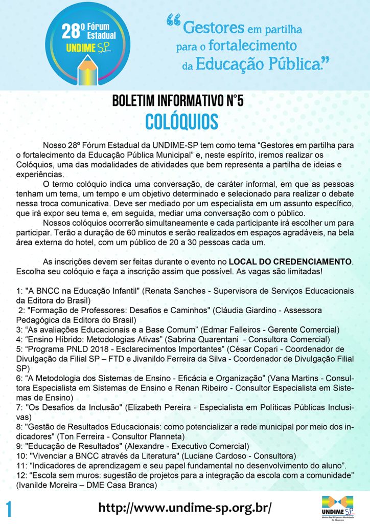 Nosso 28º Fórum Estadual da UNDIME-SP tem como tema “Gestores em partilha para o fortalecimento da Educação Pública Municipal” e, neste espírito, iremos realizar os Colóquios, uma das modalidades de atividades que bem representa a partilha de ideias e experiências.