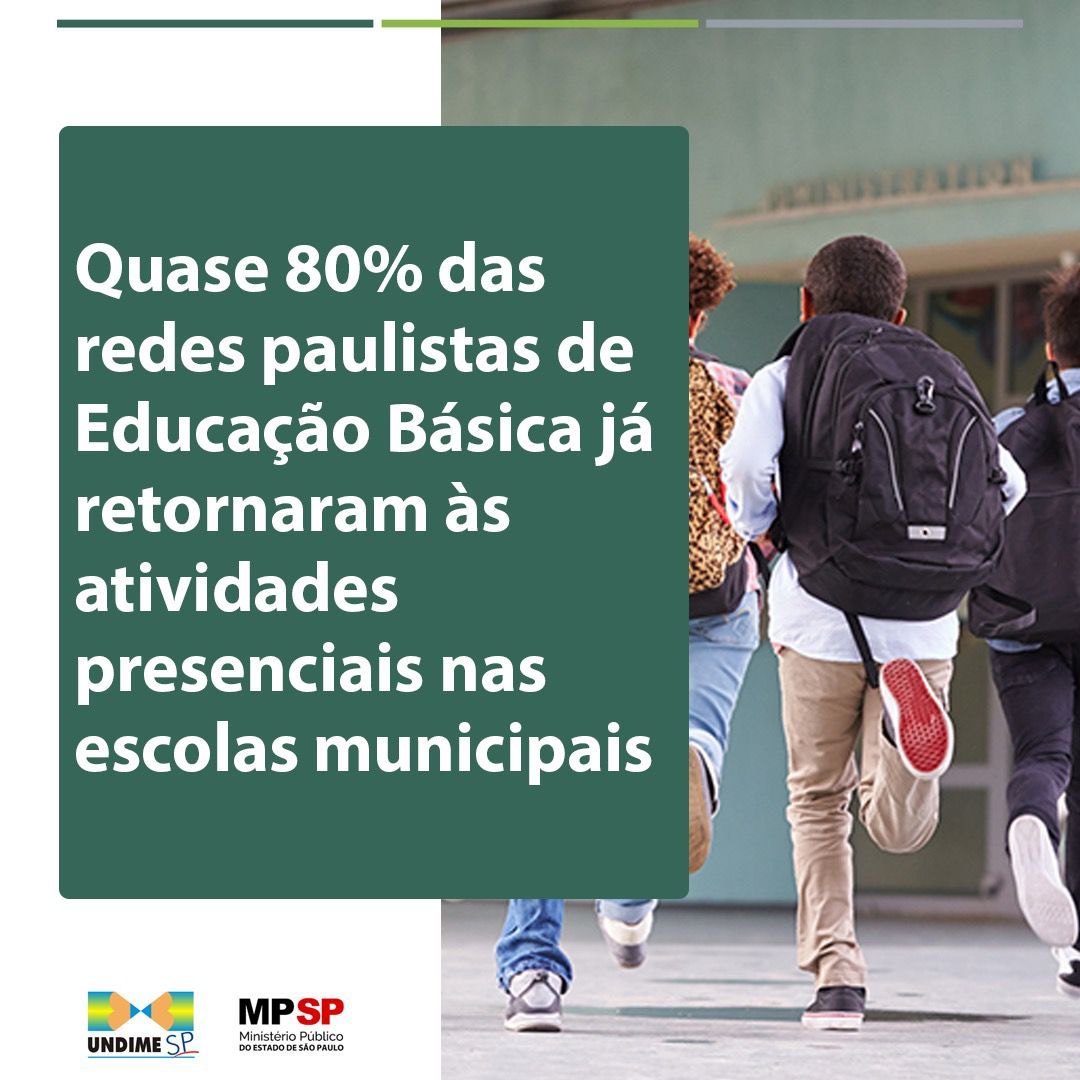 Um levantamento idealizado com o apoio do Grupo de Atuação Especial de Educação da Capital (GEDUC), do Ministério Público do Estado de São Paulo, mostrou que 79,1% das redes municipais de Educação do estado de São Paulo já retornaram com às aulas e atividades presenciais, com alunos, nas unidades escolares.
