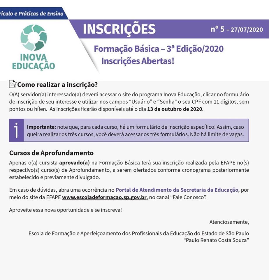 Estão abertas a partir de hoje, 27 de julho de 2020, as inscrições para a 3ª Edição/2020 da Formação Básica do Programa Inova Educação para os três cursos que passaram a compor o Currículo do Estado de São Paulo em 2020: