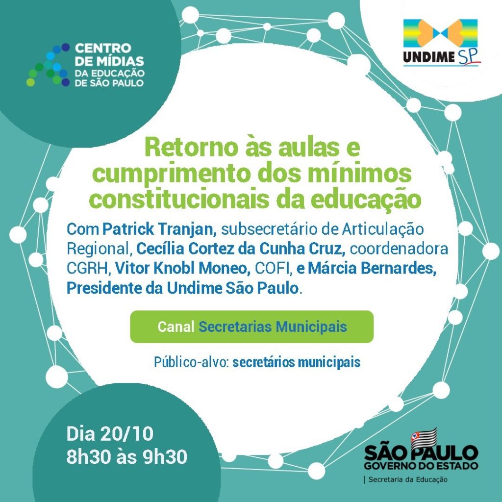 Nesta quarta-feira, 20, a partir das 8h30 (Horário de Brasília), a Secretaria de Estado da Educação (SEDUC-SP) e a Undime São Paulo realizarão uma videoconferência para falar sobre o “Retorno às aulas presenciais e cumprimento dos mínimos constitucionais da Educação”.