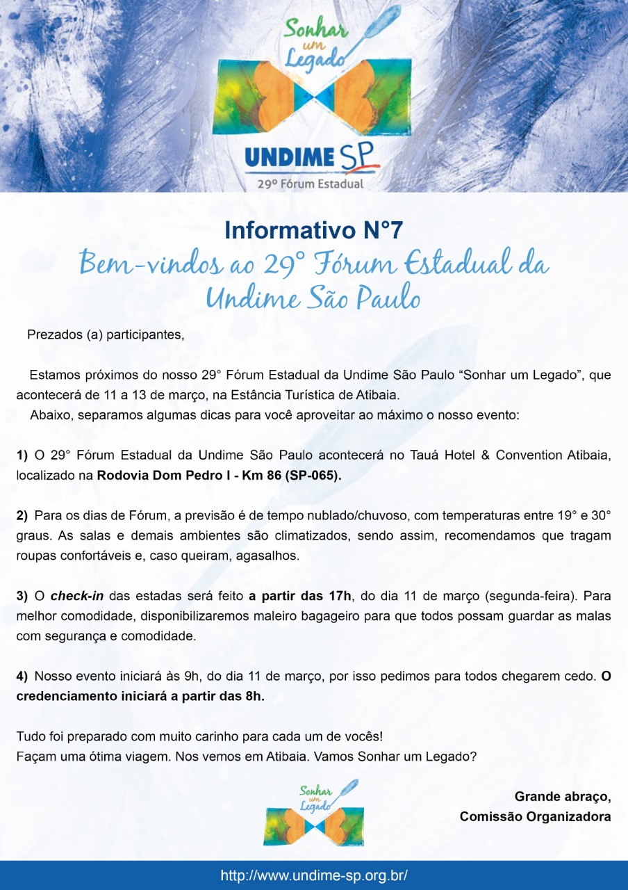 Estamos próximos do nosso 29° Fórum Estadual da Undime São Paulo “Sonhar um Legado”, que acontecerá de 11 a 13 de março, na Estância Turística de Atibaia.