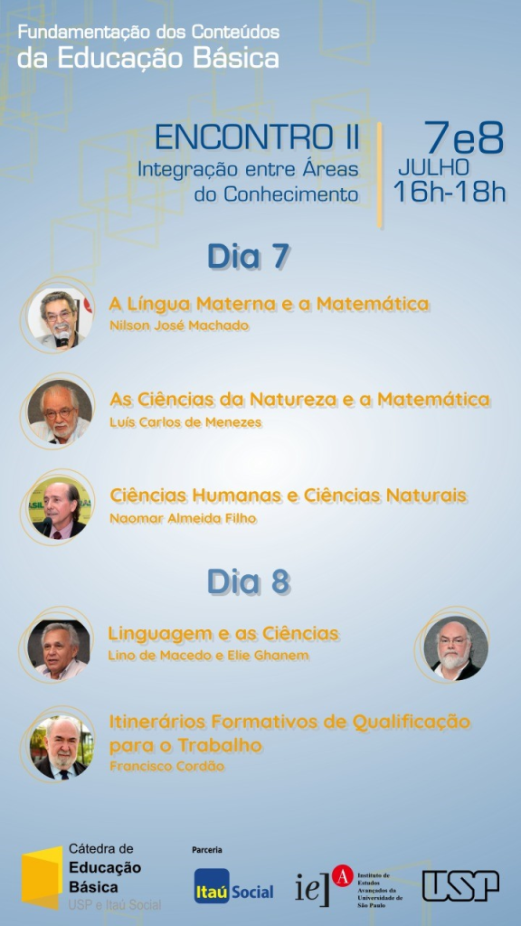 Nos dias 7 e 8 de julho, às 16h, a Cátedra de Educação Básica da USP terá mais uma atividade online do ciclo que trata da fundamentação dos conteúdos da educação básica. Gratuito, o encontro é voltado para professores da rede pública de ensino básico e terá exposições de pesquisadores da Cátedra, que abordarão aspectos e desafios da integração entre as áreas do conhecimento. Depois, os participantes vão integrar grupos de discussão sobre o tema.