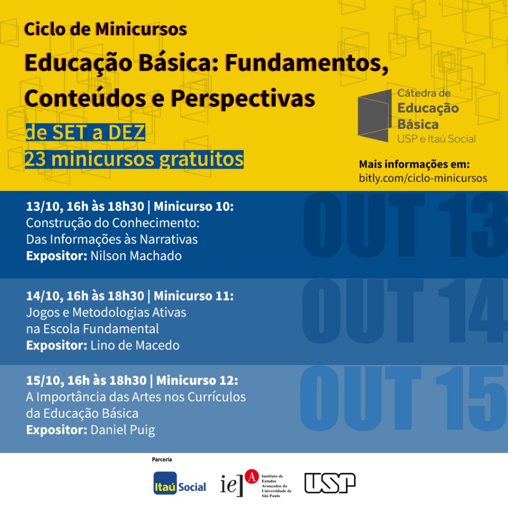 Voltado a professores do ensino básico, o ciclo de minicursos da Cátedra de Educação Básica da USP terá, na semana que vem, seu quarto bloco de atividades. No dias 13, 14 e 15 de outubro, os expositores tratarão da construção do conhecimento, de jogos e metodologias ativas na escola fundamental, e da importância das artes nos currículos da educação básica.