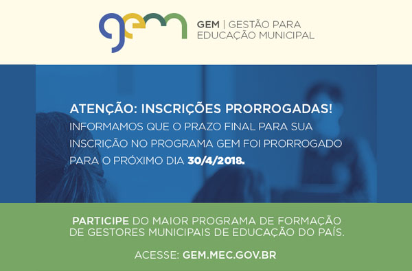 O prazo para inscrições aos cursos do programa Gestão para a Educação Municipal (GEM) serão prorrogados para 30 de abril. O procedimento deve ser feito pela internet. Dirigentes e técnicos municipais de educação interessados em realizar aperfeiçoamento, especialização lato sensu em gestão da educação pública ou mestrado profissional em gestão da educação municipal podem se inscrever. Os gestores também deverão inscrever um técnico de carreira das respectivas secretarias no programa.