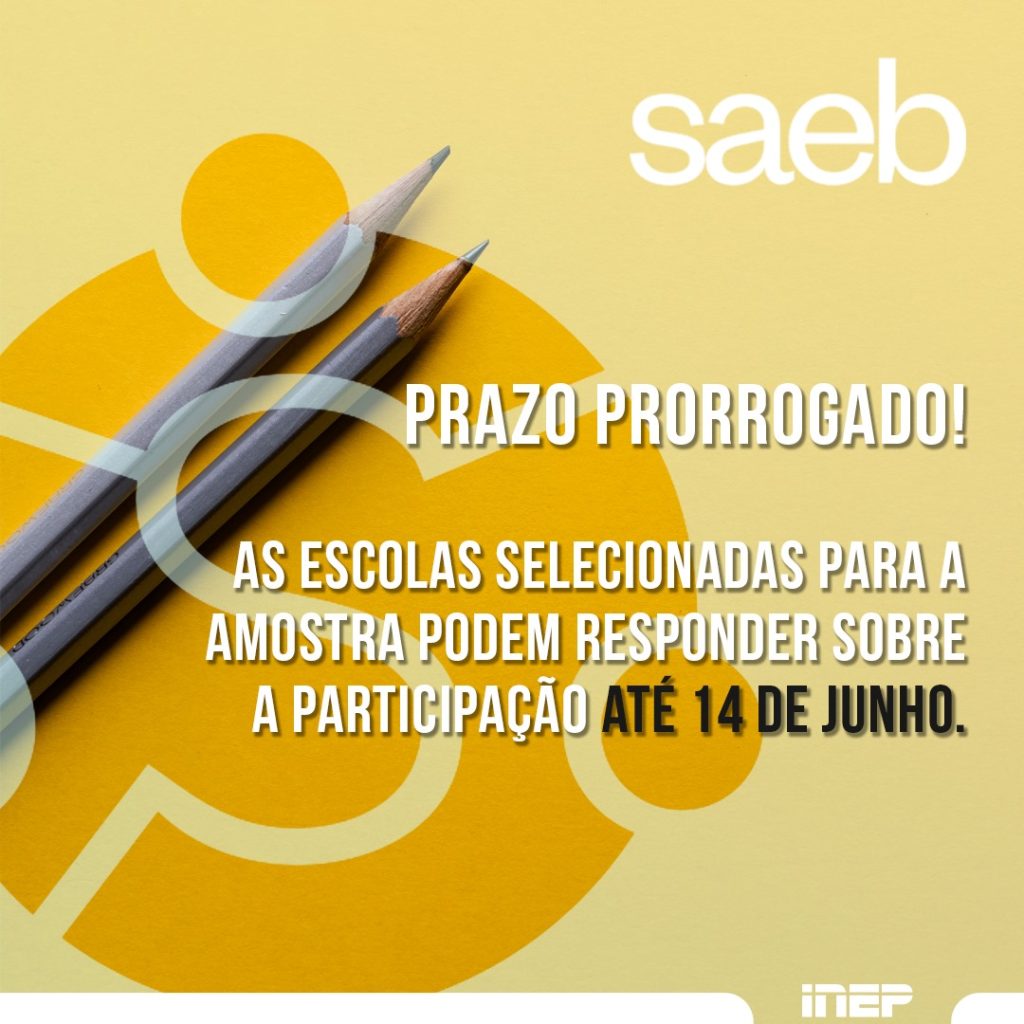 As escolas selecionadas para compor a parte amostral do Sistema de Avaliação da Educação Básica (Saeb) de 2019 têm novo prazo para responderem sobre sua participação. O Instituto Nacional de Estudos e Pesquisas Educacionais Anísio Teixeira (Inep) mudou a data limite de 10 para 14 de junho, até 17h59, no horário de Brasília.