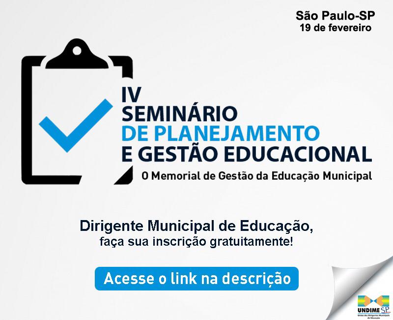 A Undime São Paulo abriu nesta quinta-feira, 30, as inscrições para o Seminário de Planejamento e Gestão Educacional que realiza todos os anos. Com o objetivo de respaldar os municípios paulistas que têm o desafio e a responsabilidade de finalizar as ações e projetos que planejaram para a gestão pública 2017/2020, que farão transição de governo e, também, pensando em assegurar a continuidade dos projetos realizados pela atual gestão, o seminário será realizado no dia 19 de fevereiro, no Salão Nobre da Secretaria de Estado da Educação, em São Paulo.