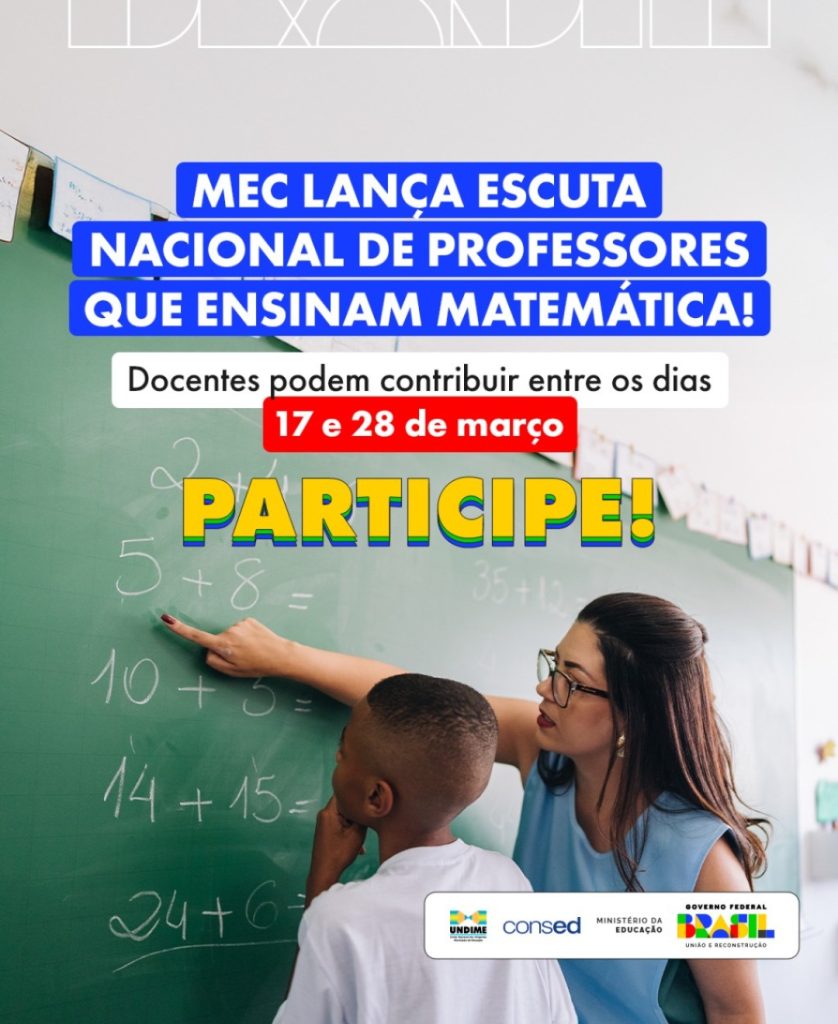 O Ministério da Educação (MEC) iniciou, nesta segunda-feira, 17 de março, a Escuta Nacional de Professores e Professoras que Ensinam Matemática para profissionais dos ensinos fundamental e médio da educação básica e da educação profissional e tecnológica (EPT). A pesquisa, coordenada por meio da Secretaria de Educação Básica (SEB), coletará contribuições de docentes a fim de orientar e a definir ações e estratégias para melhoria da aprendizagem nessa área de conhecimento, com base nas necessidades e nas demandas apontadas pelos professores. A ação seguirá até o dia 28 de março.
