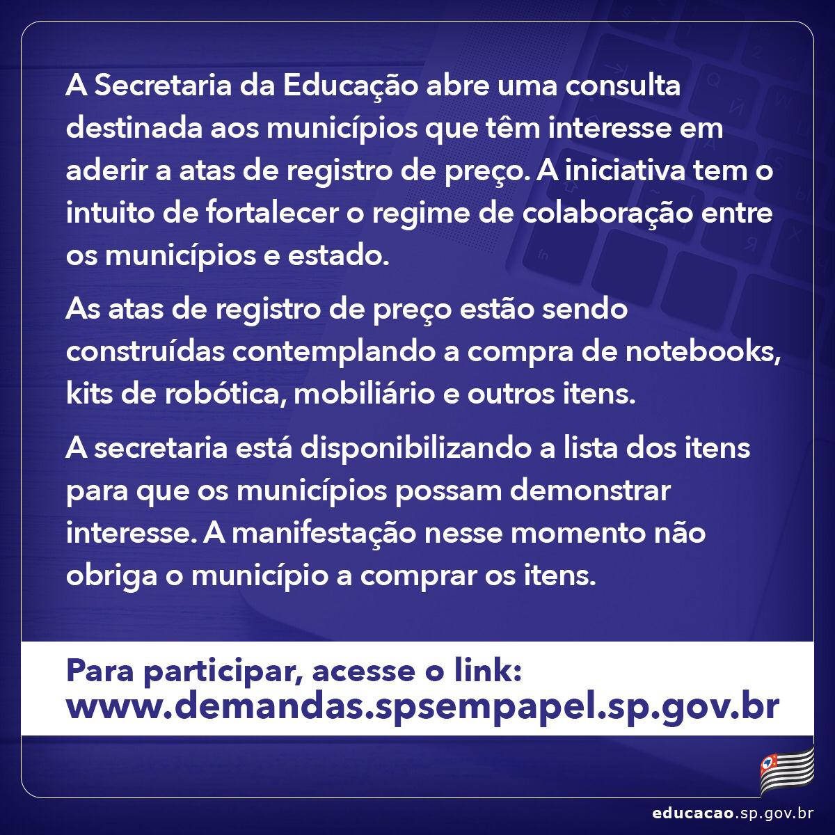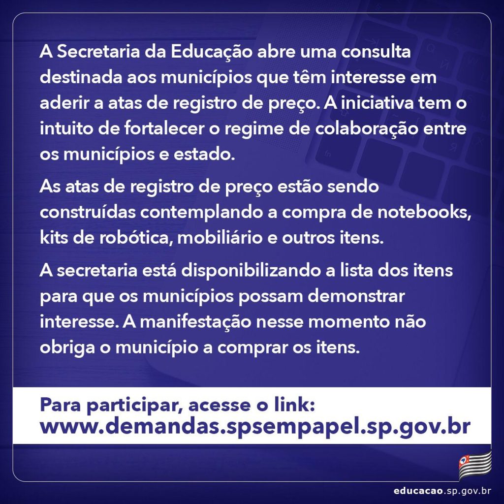 A Secretaria da Educação abre uma consulta destinada aos municípios que têm interesse em aderir a atas de registro de preço. A iniciativa tem o intuito de fortalecer o regime de colaboração entre os municípios e o estado.