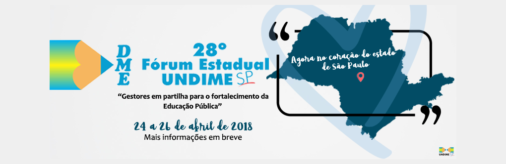 A Undime São Paulo realizará de 24 a 26 de abril de 2018 a 28ª edição do Fórum Estadual que realiza anualmente. Neste ano, o evento acontecerá em outro município, localizado no coração do estado de São Paulo, que será divulgado dentro em pouco.