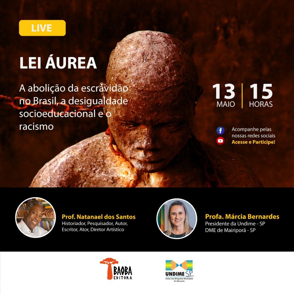 Em alusão aos 133 anos da lei que extinguiu a escravidão no país (o último do ocidente), a Undime São Paulo e a Baoba Editora promoverão na próxima quinta-feira, 13 de maio, a partir das 15h (horário de Brasília), uma videoconferência com o tema “Lei Áurea – A abolição da escravidão no Brasil, a desigualdade socioeducacional e o racismo”.