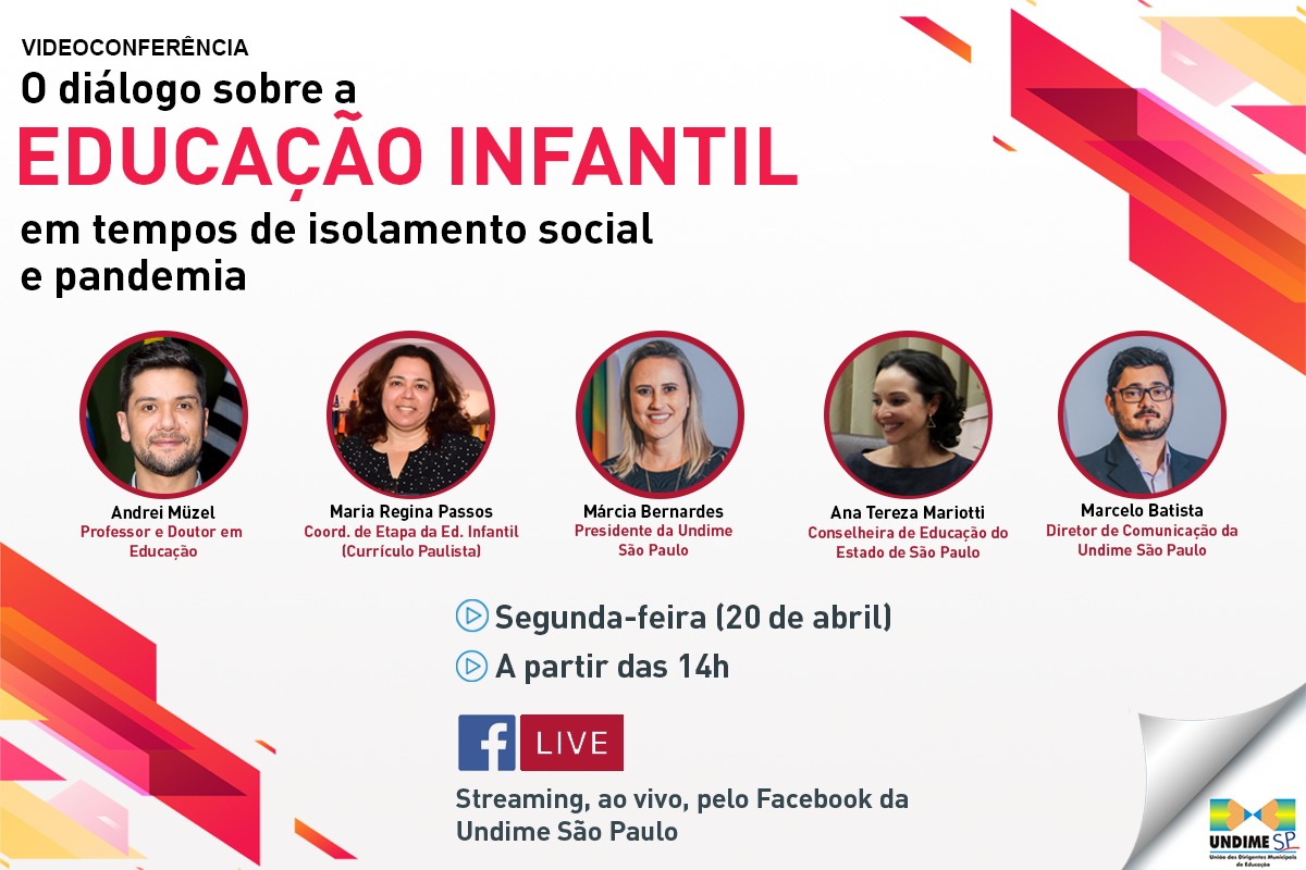 A União dos Dirigentes Municipais de Educação do Estado de São Paulo, Undime-SP, realizará na próxima segunda-feira, 20 de abril, véspera de feriado, a partir das 14h, uma videoconferência que abordará a etapa da Educação Infantil e seus efeitos em relação ao isolamento social devido ao surto global da COVID-19, o novo coronavírus.